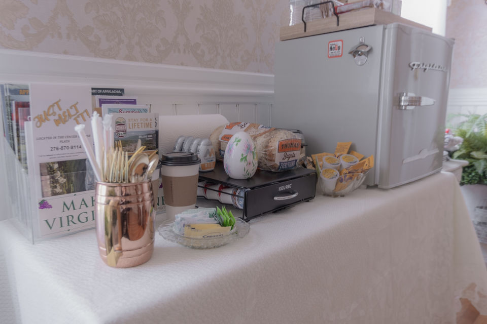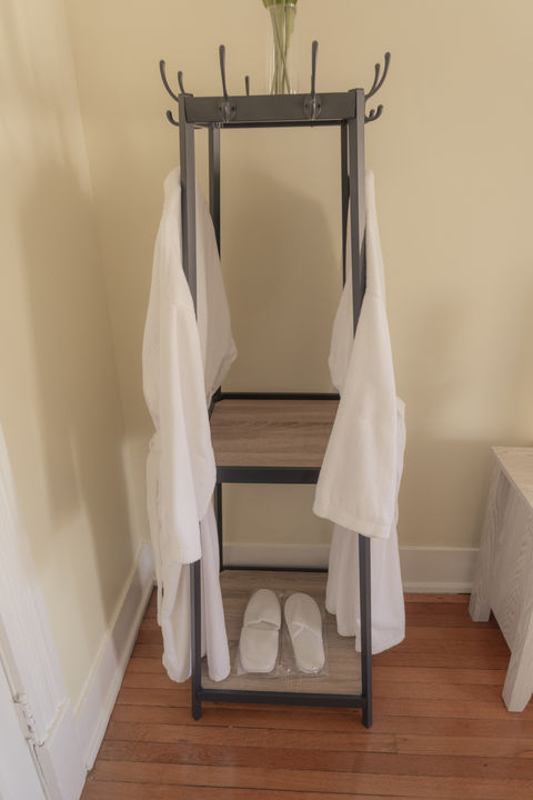 All guest rooms have digital bolt lock keypad, mini fridge, microwave, Keurig, dishes, plates, goldware, remote control flatscreen TV, closet, ceiling fan, WIFI, central heat & air, designer bedding, pillows, sheets, robes, tall windows with valanced curtains & warm wood floors. Thoughtful touches of seasonal decor & glass bowls with mints & chocolates make guests of Nottingham Place feel welcome and comfortable.