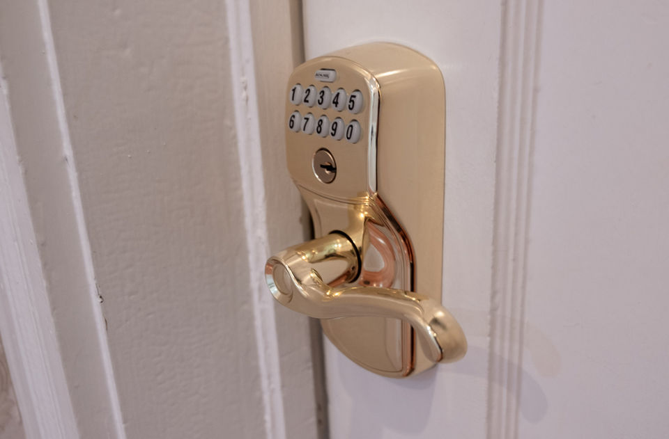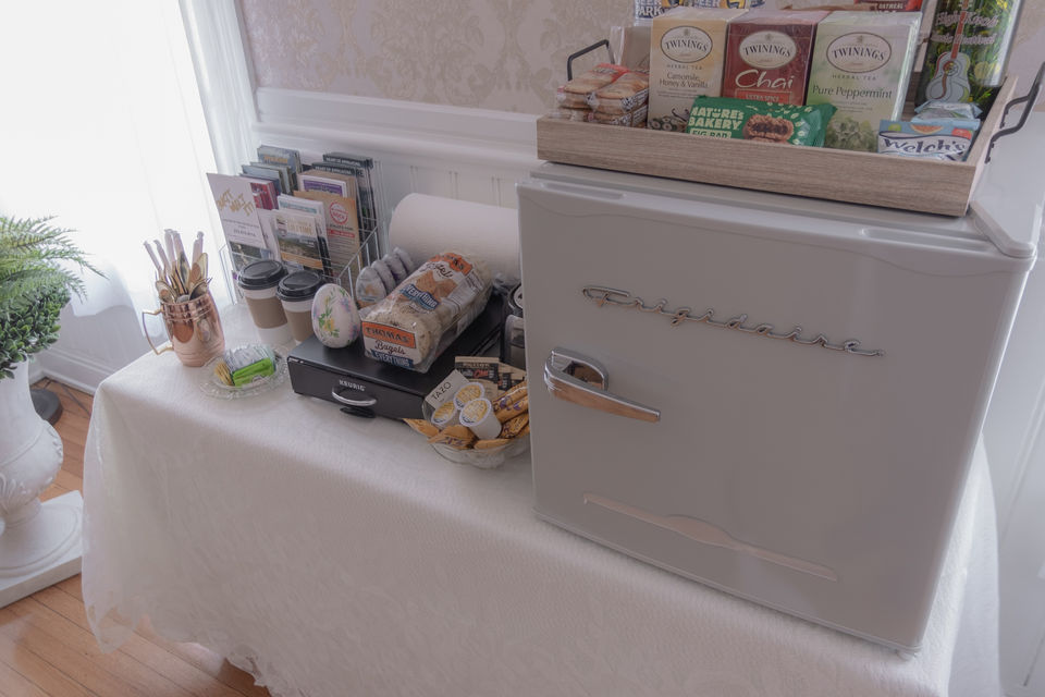 All guest rooms have digital bolt lock keypad, mini fridge, microwave, Keurig, dishes, plates, goldware, remote control flatscreen TV, closet, ceiling fan, WIFI, central heat & air, designer bedding, pillows, sheets, robes, tall windows with valanced curtains & warm wood floors.